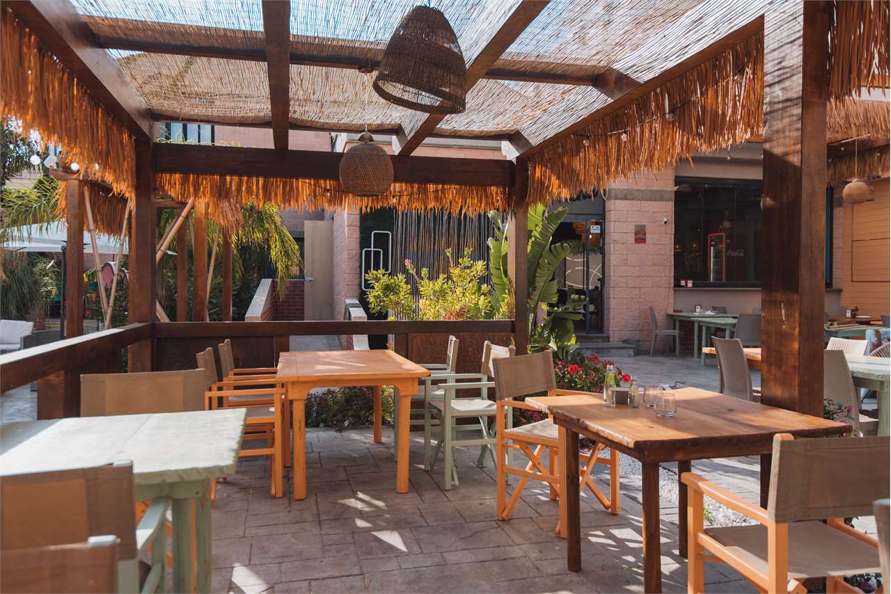 Area accoglienza coperta con eleganti tettoie in legno, tavoli e sedute ideali per colazioni, aperitivi e momenti conviviali all’aperto.