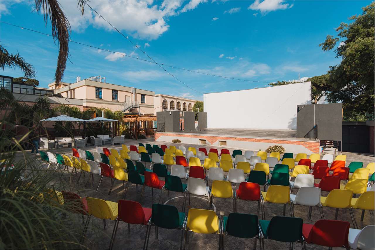 Palco di 180 mq, perfettamente attrezzato per concerti, spettacoli, rassegne culturali, convegni ed eventi aziendali, con ampia area antistante dedicata al posizionamento delle sedute per il pubblico.
