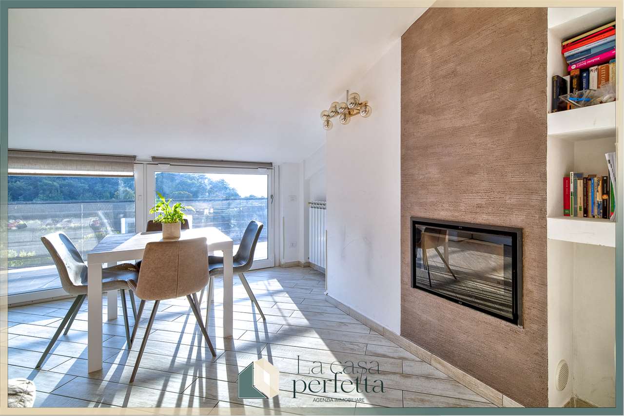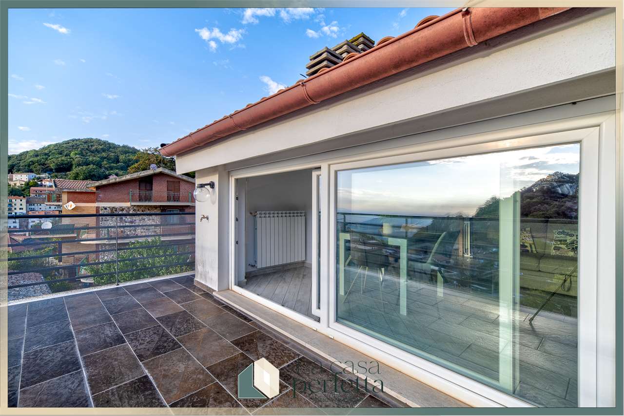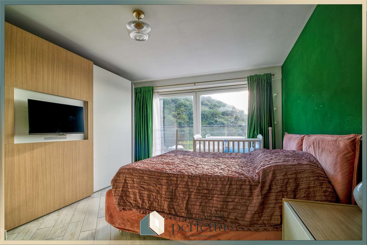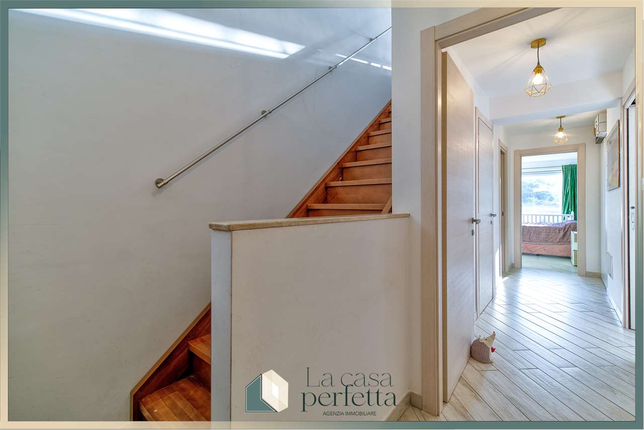 Al piano d’ingresso trovi la zona notte: una camera matrimoniale di generose dimensioni illuminata da un’ampia vetrata, una cameretta con balcone, un pratico ripostiglio e un elegante bagno con doccia . Salendo la scala interna ti accoglie la zona giorno mansardata, caratterizzata da una sala con camino e grande vetrata panoramica che si apre su un terrazzo angolare con splendida vista mare, il luogo perfetto per cene all’aperto e momenti di relax. A completare il piano ci sono un cucinotto completamente arredato, anch’esso con accesso diretto alla terrazza, e un secondo bagno con vasca.