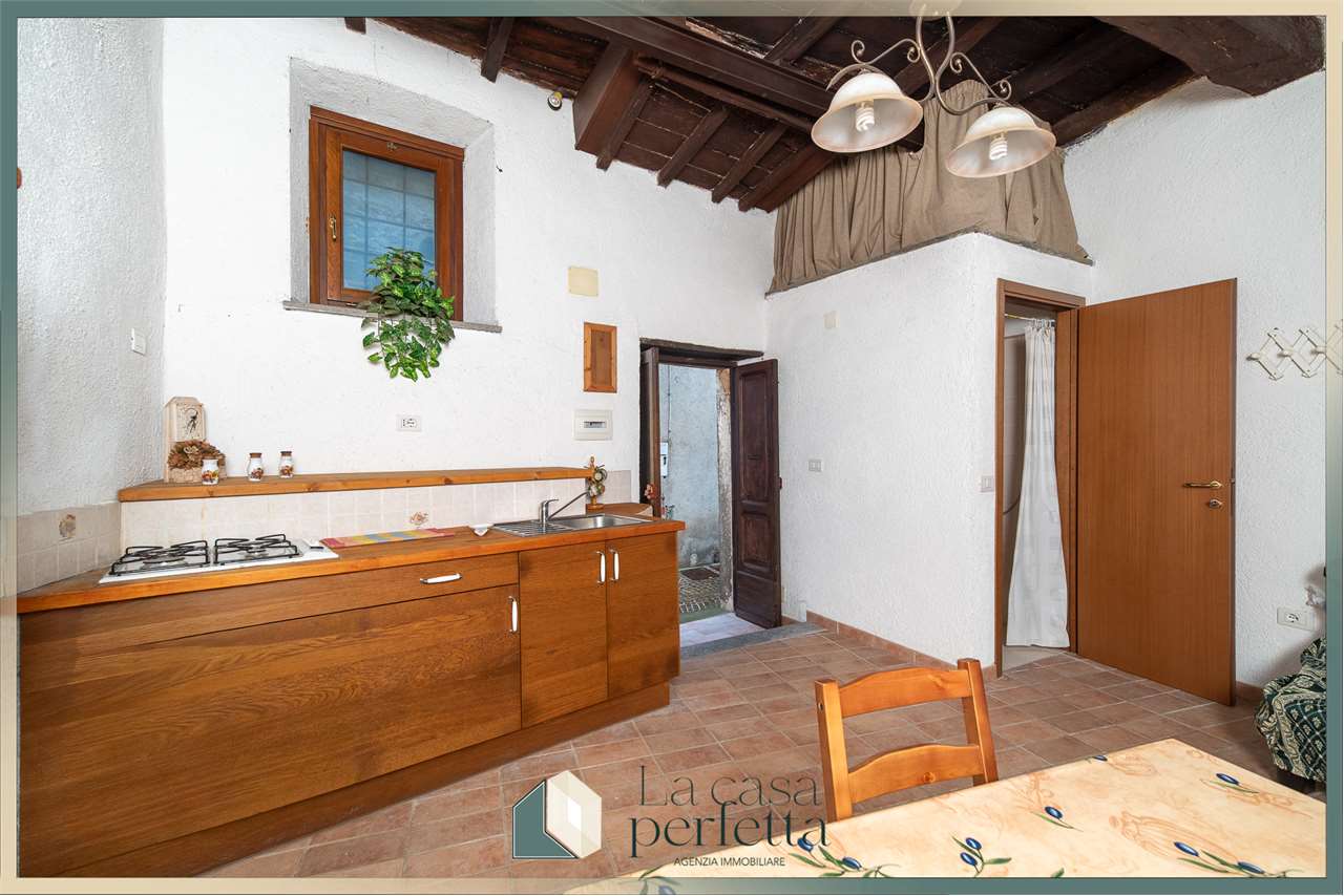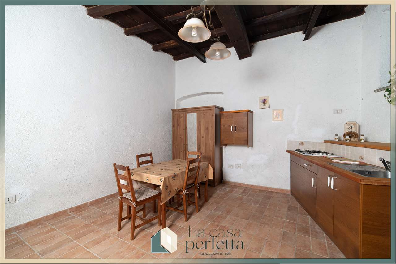 La ristrutturazione è stata totale e pensata per esaltare il carattere tipico del centro storico, lasciando protagoniste le travi in legno a vista e i pavimenti in cotto, che regalano calore e atmosfera. La presenza della canna fumaria aggiunge un valore importante perché permette di installare una stufa o un camino, trasformando l'ambiente in un rifugio accogliente anche nei mesi più freddi.